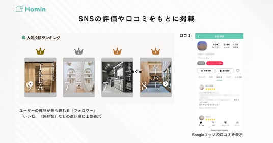 Hominは、家づくりを検討するユーザーが、住宅会社の詳細情報、Instagramの投稿、実際に家を建てた方の口コミなどをもとに比較検討できるサービスです。住宅アドバイザーへの相談や来場予約機能も備えており、理想のライフスタイルを実現する家づくりをサポートします。
