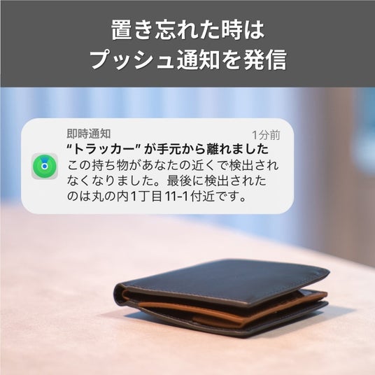 本商品はiPhone・iPadのアプリケーション「探す」を利用し、位置を確認できるスマートトラッカーです。大切な物の置き忘れや紛失を防止できます。本商品が入った持ち物が手元から離れると、端末にプッシュ通知でお知らせが届くため、万が一の置き忘れを防止します。本体にはスピーカーが内蔵されているため、アプリケーションからスマートトラッカーの音を鳴らすことができます。これにより持ち物を見つけやすくします。紛失に気づいた時は、アプリケーションから「紛失モード」へ切り替えることで、持ち物が検出された位置情報を登録端末に通知します。