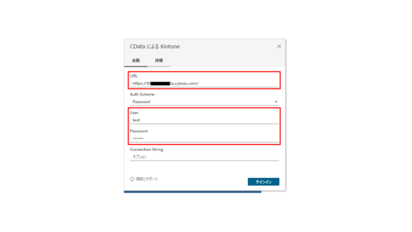 [Auth Scheme](認証方式)として[Password]を選択している場合は、URL=kintoneのログインURL、User=kintoneのログインID、Password=kintoneのログインパスワードの3点セットになります。