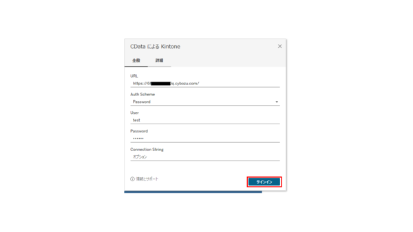 5.サブウィンドウ[CData によるKintone]が開くので、kintoneとの接続に必要な情報を入力します。