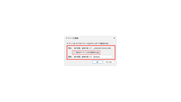 11.[現在]のデータソース(本記事ではCSVファイル)と[置換]するデータソース(本記事では8で設定した「案件管理(営業支援パック)」)を選択し、[OK]をクリックします。