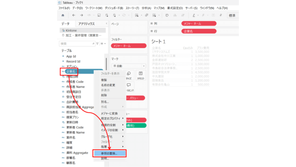 例えば、CSVファイルにしか存在しない「企業名」を置換後のデータソースにある「顧客名」を参照するよう変更したい場合は、データペインの「企業名」の上で右クリックし、[参照の置換]にて参照先を「顧客名」に変更します。