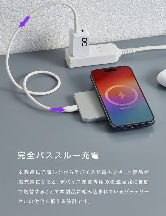 本製品に充電しながらデバイス充電もでき、本製品が満充電になると、デバイス充電専用の直流回路に自動で切換することで本製品に組み込まれているバッテリーセルの劣化を抑える設計です。