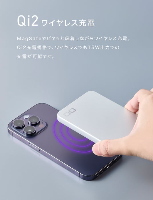 Qi2規格・5000mAh・極薄8.7mm・約117gの軽量・MagSafeスマホに対応・ケーブル充電時20W対応・USB-Cポート搭載
