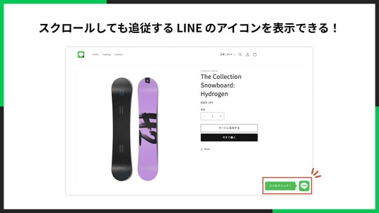 「シンプルLINE誘導|お手軽追従LINEアイコン」を使用すると、ストアの画面上にスクロールしても追従する LINE アイコンを表示できます。アイコンをクリックすると、設定されている URL が開かれます。また、アイコンだけではなく、吹き出しテキストも設定することができます。