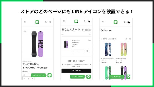 商品ページ(左)、カートページ(中)、コレクションページ(右)での LINE アイコンの表示例
