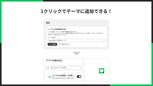 「シンプルLINE誘導|お手軽追従LINEアイコン」では、LINE アイコンを表示するためのアプリブロックを1クリックでテーマに追加できます。難しい操作は必要なく、誰でも簡単にアプリを始められます。