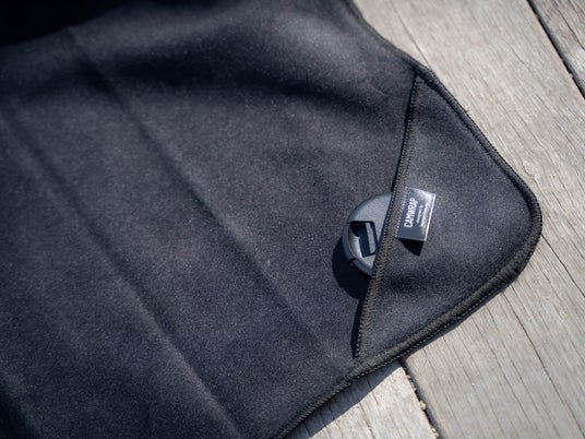 CAMWRAP [カムラップ] の生地の色は単色のブラック・グレーの2色展開でシンプルかつミニマルに包んでいただけます。 また、ロゴが配置されたラベルを上に引っ張ると”くっつく三角ポケット”が剥がれ小物を入れやすくなります。