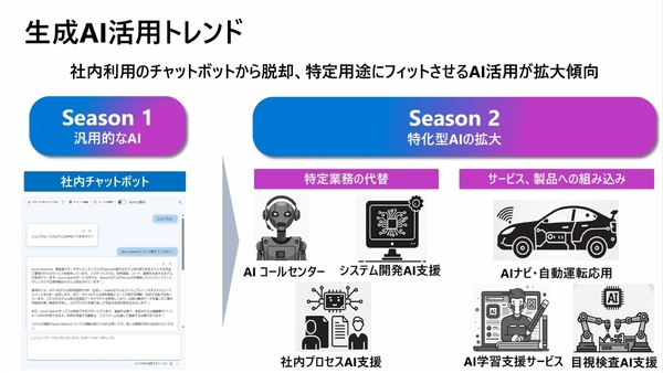 シーズン1は、「汎用的なAI」が登場して、企業がこぞって社内チャットボットを試した段階だ。「精度を求めてRAGの沼にはまり、いまだ抜けられていない企業すらある。しかし、一問一答の検索エンジンなため、それほど使われなかった」と大谷氏。