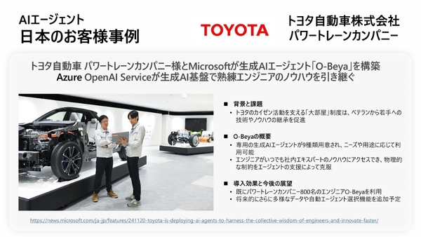 Microsoft Igniteでも紹介されたのが、トヨタ自動車のパワートレーンカンパニーにおける、「大部屋」制度をAI化したユースケースだ。ひとつの部屋にエキスパートが集まり、切磋琢磨しながら開発をするという同制度を、AIエージェントで実現。車体やエンジンなど複数の領域で専門性を持った9種類のエージェントが連携してエンジニアを支援する。リタイアしたエキスパートの知見をどう残すか、という日本企業の課題に応えるユースケースであり、問い合わせも殺到したという。