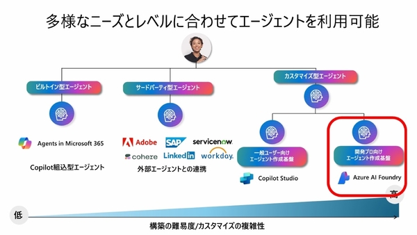 三つ目が、ユーザー企業やパートナーがAIエージェントを“創る”「カスタマイズ型エージェント」だ。開発基盤として、一般ユーザー・市民開発者向けの「Copilot Studio」、開発プロ向けの「Azure AI Foundry」が用意される。