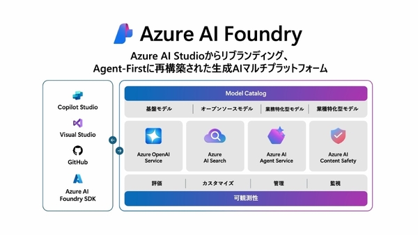 開発プロ向けのAzure AI Foundryは、もともと提供していたAzure AI Studioをリブランディングしたものだ。AIエージェントを開発するための各種ツールや、開発環境からのシームレスなアクセスを提供。本番環境でのセキュリティを担保するためのオブザーバビリティまでカバーする。