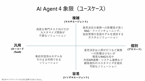 また、大谷氏は、AIエージェントを4象限で分類。汎用(ローコード/SaaS)と個別(プロコード)、複雑(マルチエージェント)と容易(シングルエージェント)を軸とした場合、「汎用かつ容易」「汎用かつ複雑」の領域は、マイクロソフトがビルトイン型エージェントやノーコード・ローコード開発のCopilot Studioでカバーするという。