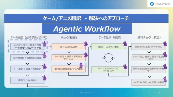 AIソリューション事業を手掛けるヘッドウォータースが共有したのは、「ゲーム・アニメ翻訳」のユースケースだ。本案件では、複数の専門的なAIエージェントが手順に沿って役割をこなす「エージェンティックワークフロー(Agentic Workflow)」のアプローチを採用。最初のエージェントが作品の属性や関係性、ストーリーを抽出することで、続くエージェントが世界観やキャラクターに合わせた翻訳が可能になる。