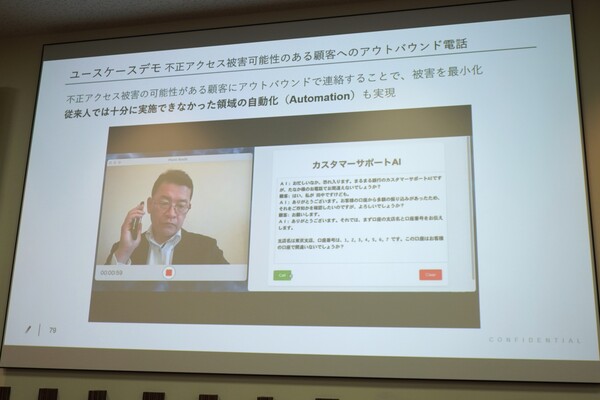 コンプライアンスの領域でも活用が進んでいるという。具体例として、AIエージェントが取引履歴から不審な振り込みを検知して、口座の所有者に音声通話で確認の上で口座を停止するという、インターフェイスに音声を用いたデモが披露された。