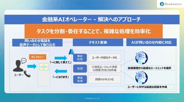 実際に2024年から稼働しているのが「金融系AIオペレーター」のユースケースだ。AIオペレーターが問い合わせの内容に応じて、専門的なAIエージェントに質問を振り分ける仕組みで、“タスクを分担・委任することで複雑な処理を効率化”している。