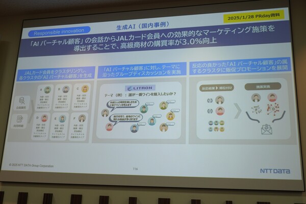 その他にも、JALカードとは、各クラスタの「バーチャル顧客」をディスカッションさせた内容をもとにプロモーションを展開するという、マルチエージェントに近いプロジェクトも進めているという。
