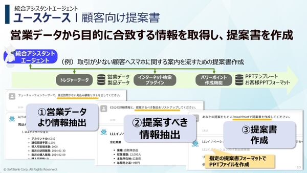単一タスクベースのエージェントとして「顧客向けの提案書」のユースケースが挙げられた。AIエージェントが指示に合致した情報を営業データから抽出、さらに提案すべき情報を選定して、それをもとに提案書を生成するという仕組みを構築しているという。