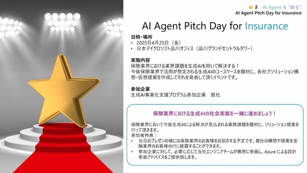 AIエージェントを”創る”ための支援では、ビジネスの創出を推進するイベントを月1で実施する。4月25日には、保険業界特化のAIエージェントを仮想提案してもらうピッチコンテスト「AI Agent Pitch Day for Insurance」を開催。5月は教育業界を予定するなど、さまざまな業界を対象に展開される。