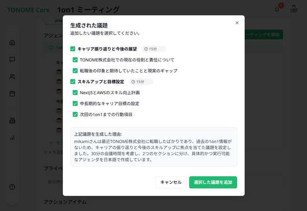 「TONOME Core」は、AIを活用して管理職の日常的なマネジメント業務を支援するプラットフォーム。AIがアジェンダや議事録の自動作成など1on1の準備を行うことで、管理職が人に向き合うことに専念できるように支援する。