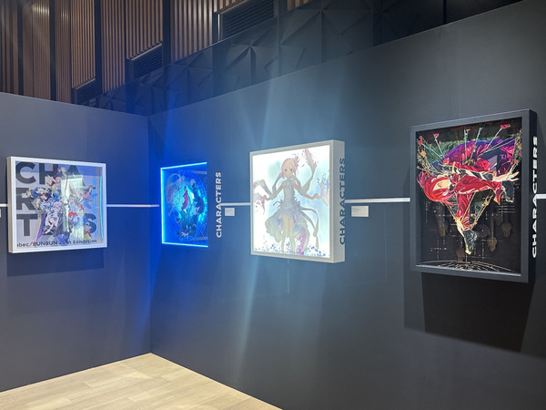 いずれの作品も本展覧会で初めて見られた新規イラスト。角度をつけて見ると立体的にキャラクターたちが浮かび上がります。さらには、後ろから照らす光が幻想的な美しさを表現! この特別な作品はぜひ会場に足を運んで見てほしいです。