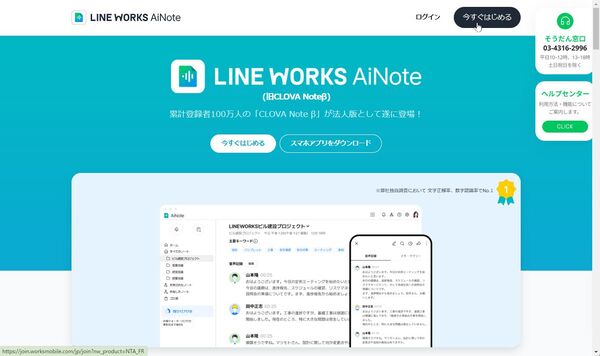 まず、LINE WORKS AiNoteを使う場合、LINE WORKSを使っていないユーザーであれば、ブランドページの「今すぐ始める」をクリックして、新規アカウントを開設すればいい。LINE WORKS AiNoteのスマホアプリから「サービス環境の作成」をタップしても開設できる。