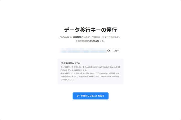 次の画面でデータ移行キーが発行されるので「コピー」ボタンをクリックし、文字列をコピーしよう。このキーの有効時間は10分と短いので注意すること。「データ移行リクエストを行う」をクリックし、コピーしたデータ移行キーを貼り付け、「登録」をクリックすれば完了だ。リクエスト後、最大48時間以内に移行される。