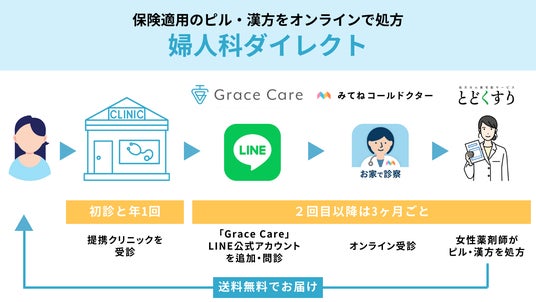 本サービスは、企業に対し女性従業員向けの福利厚生の施策として提供するものです。初診及び年 1 回以上の提携クリニックでの対面受診を必須としながら、3 ヶ月毎の診療をオンラインで受診可能としています。症状がある方の保険診療を前提とし、ピル・漢方は保険適用の薬剤を処方します。オンライン診療はグレイスグループの提供する LINE 公式アカウント「Grace Care」にて申込後、コールドクターの「みてねコールドクター」にて受診、おかぴファーマシーの「とどくすり」にて薬の無料自宅配送が可能です。これにより、受診ハードルを下げながら安心してピル・漢方の服用が続けられる体制を 3 社で協業して提供します。