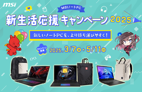 エムエスアイコンピュータージャパンは、3月7日から5月11日まで、対象のMSIノートPC製品を購入すると豪華な特典がもらえる「MSI ノートPC 新生活応援キャンペーン2025」を開始した。さらに、レビュー投稿でさらなる特典が手に入る別キャンペーンも同時開催する。
