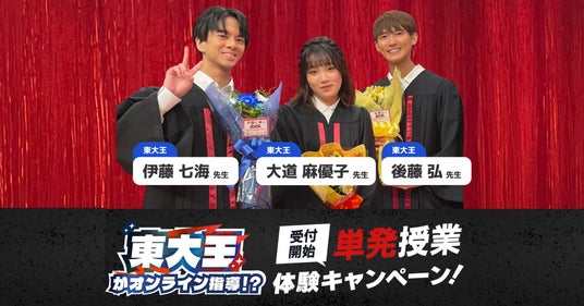 本キャンペーンでは、クイズ番組「東大王」に出演し、その知性と人柄で人気を集めているメンバー(伊藤七海・後藤弘・大道麻優子)が、60分の授業と30分の学習相談をオンラインで行います。