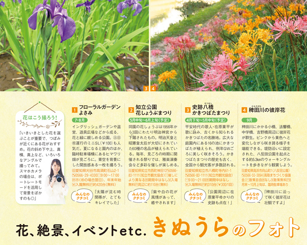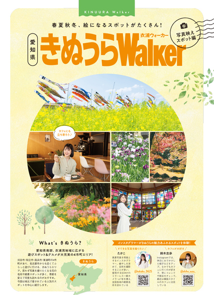 「きぬうらWalker」は、きぬうらの観光案内所などの施設で配布しているフリーペーパー。今回は「写真映えスポット編」として、花、絶景、季節ごとのイベントなど、きぬうらで必見の“絵になるスポット”をたっぷり紹介しています。