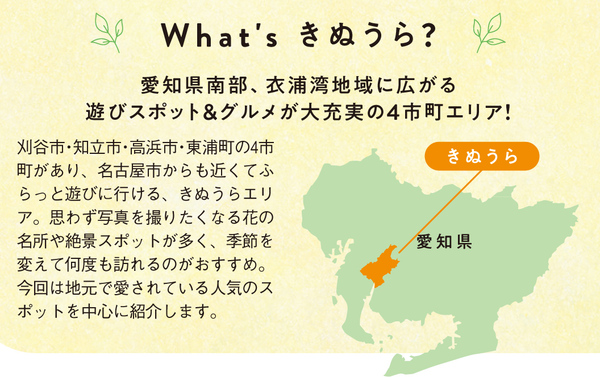 きぬうらは、愛知県南部、衣浦湾地域に位置し、愛知県刈谷市、知立市、高浜市、東浦町の4市町を含むエリア。名古屋市からもアクセスが良好で、花の名所や絶景など、日帰り観光やドライブにぴったりのお出かけスポットが充実しています。