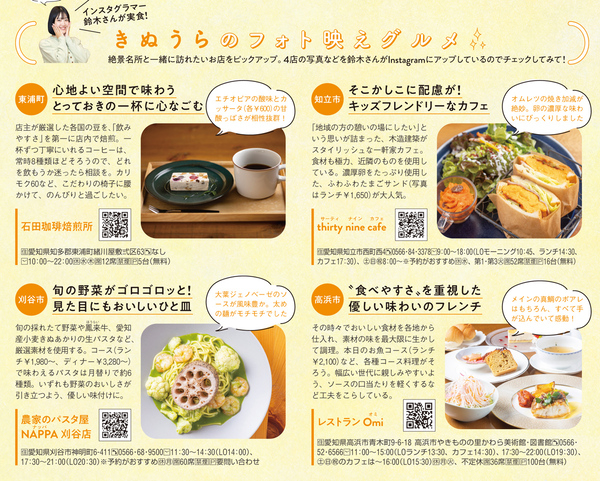 さらに、絶景や名所と一緒に訪れたい、きぬうらの「フォト映えグルメ」も掲載。心地よい空間で味わうコーヒーや、子ども連れに優しい一軒家カフェなど、注目のお店をピックアップして紹介しています。
