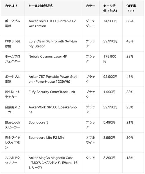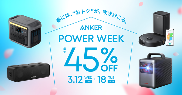 アンカー・ジャパンは3月7日、新生活シーズンに向けた大型セール「Anker Power Week」を開催すると発表した。期間は3月12日12:00から3月18日23:59までで、Anker Japan公式オンラインストアやAnker Japan公式アプリ、直営店のAnker Store(一部店舗を除く)で実施される。