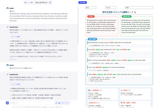 英文添削をリクエストし、ビジュアルで学習する例。「マジックプリント」は当初、教員用サービスに提供予定ですが、中長期的には生徒児童向けの学習コンテンツへの応用も想定いたします。