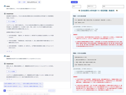 「マジックプリント」- 生成AIで、教材プリント、大学共通テストの試験対策プリントなどを作成可能。