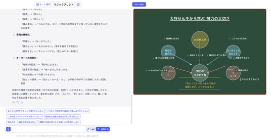 新機能「マジックプリント」(商標、特許出願中) では、単元テーマや指導案を入れるだけで、教材プリント・授業用スライド・板書計画・小テストなどの草案を図解を含む生成を行います。小学校1年生から高校生の大学受験ニーズまで幅広く対応し、特別支援学校・学級での個別の指導計画などの作成も支援いたします。また、教務関連に限らず、自由記述のアンケート結果を入れると分析結果を表示したり、校務や事務作業でも活用いただけます。