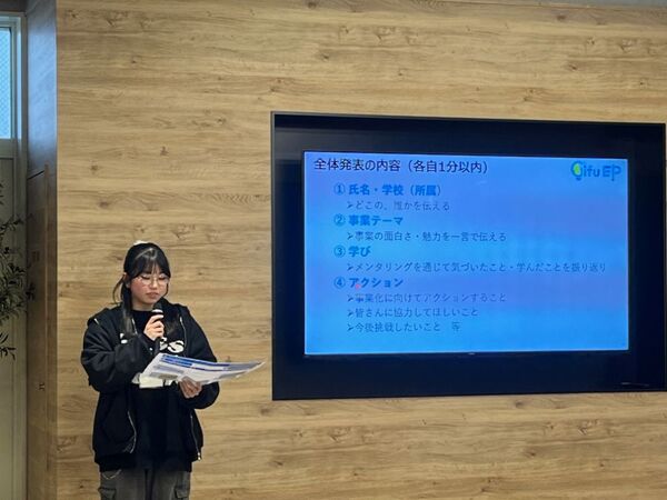 メンターとして参加した社会人の先輩のプレゼンがあり、その後、岐阜大学起業部がその活動を共有。新規事業やアントレプレナーシップの存在は、変化の激しい時代の中で自ら枠を超えて行動し、新たな価値を生み出していく精神であると、実体験を交えながら挑戦することの大切さを語った。