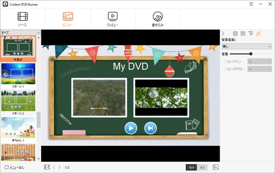 異なるテーマと場面に応じて30+のDVDメニューテンプレートを提供しています。また、ユーザーはメニューの要素(BGM/画像、テキスト、メニューボタンなど)を変更することでDVDメニューを手動で作成できます。