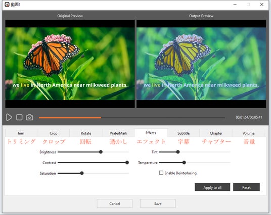 豊富な編集機能が提供されているので、書き込む前にアップロードした動画を編集できます。例えばトリミング、クロップ、回転、字幕/透かし追加、エフェクト調整などです。