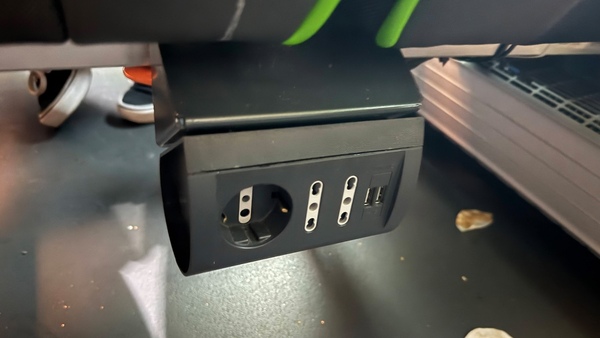 自分の席の座面の下もよくよく調べてみると、電源コンセントが見えました。なにかプラスチックのものが足元にあるな……というのは気がついていたのですが、車内が暗すぎるのと、グラグラした安っぽい手触りの箱だったので、シートの金具に取り付けるカバーかなにかと思ってたんですよ。
