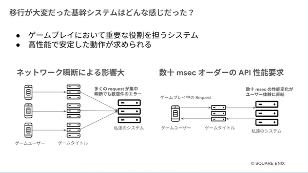 詳細は伏せられたが、移行を進めたゲーム基盤は、ゲームプレイにおいて重要な役割を担うシステムであり、高性能で安定した動作が求められていた。新作ゲームのリリースやイベント時には大量のリクエストが集中し、“ネットワークが瞬断”すると数百件のエラーが発生してしまう。加えて、ユーザー体験のために、“数十msecオーダーのAPI性能”が要求されていた。