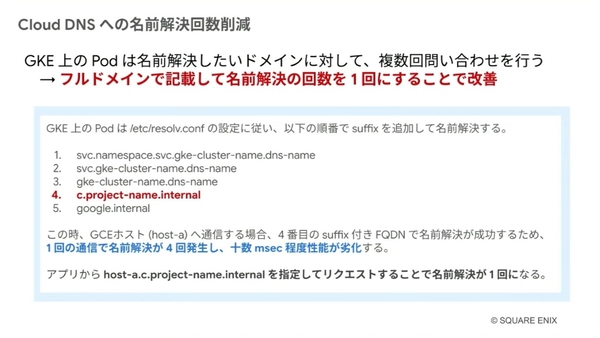 実際にとった改善策のひとつが、Cloud DNSへの名前解決回数の削減だ。GKE上のPodは名前解決したいドメインに対して複数回の問い合わせをする。これをフルドメインで記載することで、名前解決の回数が1回になるようにした。また、本環境では、Google マネージド SSL 証明書のタイプによる速度差が発生したため、従来の証明書を利用することでAPIを高速化している。