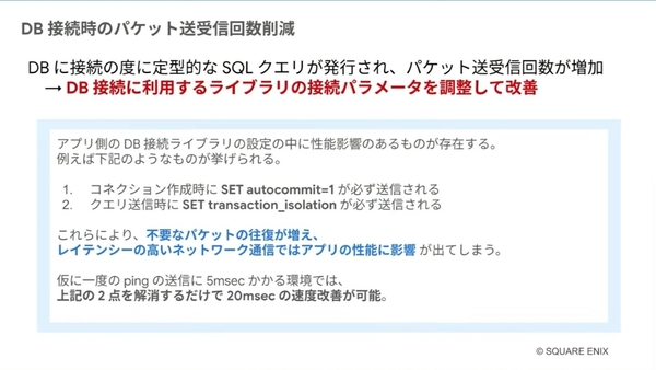 データベース接続時のパケット送受信回数も削減した。「1回あたりのパケット送信はたいしたことはないと思えるかもしれないが、クラウド環境だとそれだけで5msecほどかかってしまう」と佐藤氏。データベース接続のたびに定型的なSQLクエリが発行されるため、不要なパケットの往復が増えていたという。それを、ライブラリの接続パラメータを調整することで改善している。