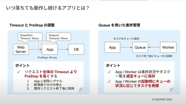 いつ落ちても動作し続けるアプリケーションには、「Time Out」と「PreStop(Podが停止命令から持ちこたえる時間)」の調整が重要になるという。ポイントは、リクエスト全体のTimeoutよりPreStopを長く設定することだ。もうひとつ重要になるのが、「Queueを用いた進捗管理」だ。アプリケーションやWorkerは、進捗状況やタスクの一覧を適宜Queueに保存、起動時にはQueueの状況に応じてタスクを再開する。