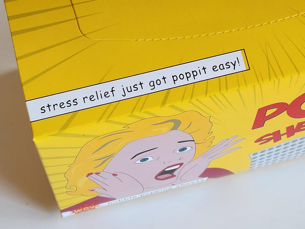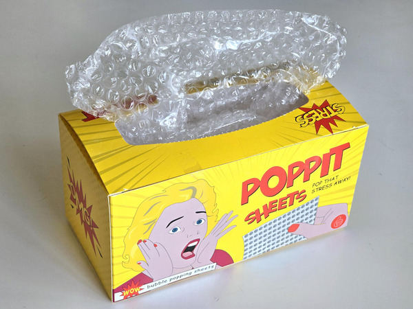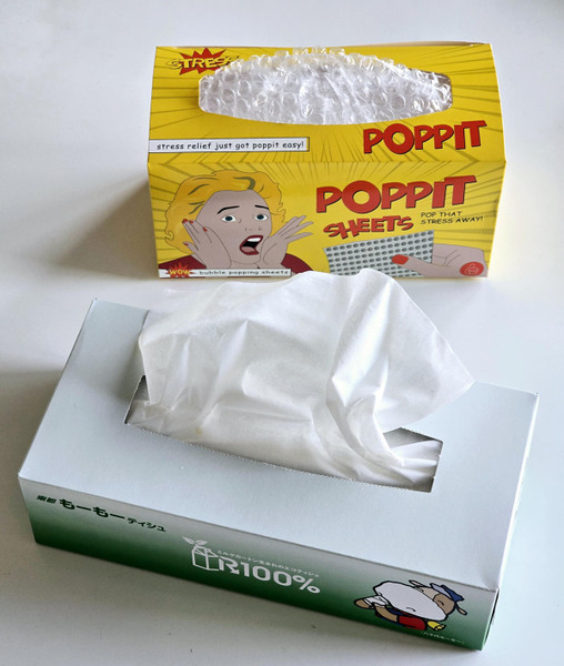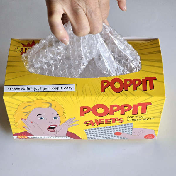 今回、筆者がtemuで衝動買いしたのは「POPPIT SHEET」と呼ばれる「プチプチシート」が20枚入ったティッシュボックス状のストレス解消ガジェットだ。箱のトップ部分に、ミシン目の入った楕円形の取り出し口がある。点線に沿って箱の一部を切り取るのもティッシュボックスとよく似ている。