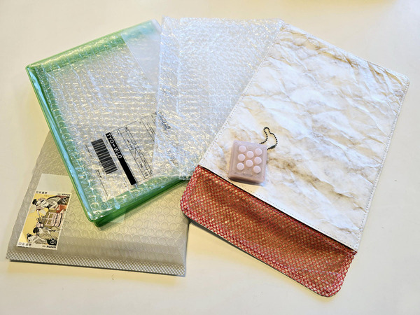 筆者宅を見渡して、気泡緩衝材を使ったモノをいくつか探してみた。どこの家にもよくあるのはDVDなどが送られてくる封筒、気泡緩衝材を少しオシャレに使ったドキュメントケース、あとはネット通販で送られてくる商品などが入っていた袋やロール状のモノ、そして電池が切れた「無限プチプチ」などが見つかった。