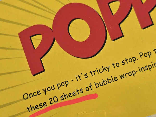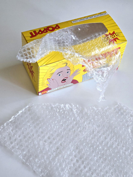 今回のPOPPITの気泡緩衝材と、国内で入手した気泡緩衝材を交互に手に持って指先でつぶしてみたところ、どうもPOPPITの方はかなりスムーズにリズミカルにプチプチできる。一方の国内物は上から指先で抑え込むだけでは、プチっとつぶせないときもあった。確実に潰すには手前の方に指先を置いて前方に空気を絞り出すようにする感じだ。