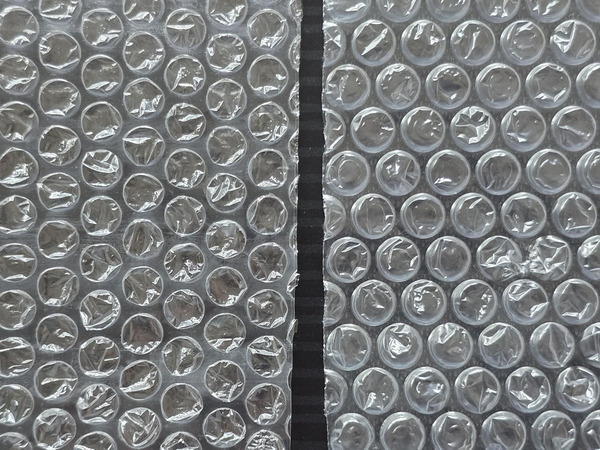 国内市場がメインで発売された「無限プチプチ」の指先フィーリングは、ほぼ国内製のプチプチの感覚に近い硬めだ。見た感じも多少気になったので筆者が手に入れた国内物のプチプチ(右側)と今回のPOPPITの気泡緩衝材(左側)を並べて近接撮影してみた。
