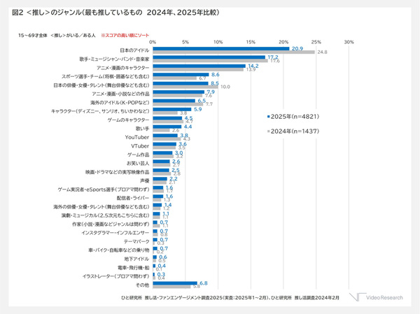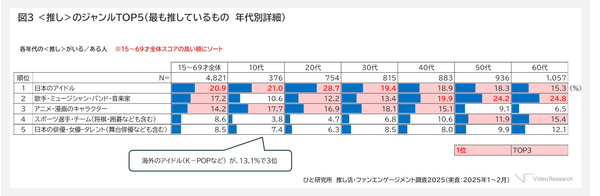 ビデオリサーチのシンクタンク、ひと研究所が15~69歳の男女1万3800人を対象に実施した「推し活・ファンエンゲージメント調査2025」より。好き/お気に入りの人物やモノで「応援したい」対象を「推し」と定義し、推しの有無やジャンルなどを聞いた。「推し」がいる/ある人は全体で38.9%と、昨年調査の35.7%から増加。“三大推しジャンル”はアイドル、音楽、アニメ/マンガだが、50~60代は「スポーツ選手・チーム」が他の世代よりも高い傾向にある。